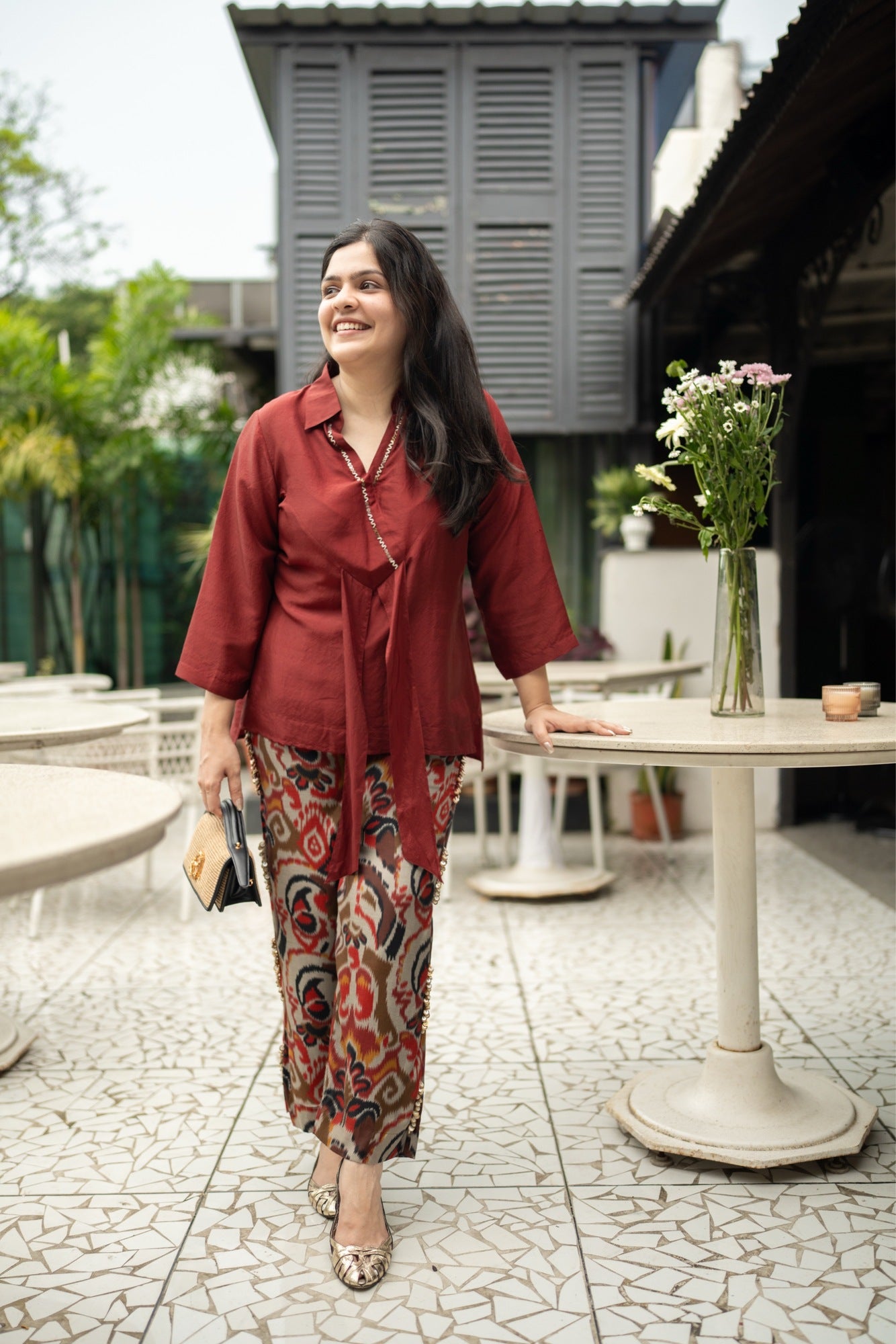 1. A set of two in one of our signature styles, the tie top with ikat printed pants - the perfect pair for a lunch with the girls or nightouts alike! 2. With hand stitched metal details, the top has just the right amount of glimmer, tha pants feature our signature MOP embroidery 3. The top is made in pure silk dupion and the pants in muslin - pair them together or separately, this set will go a long way!