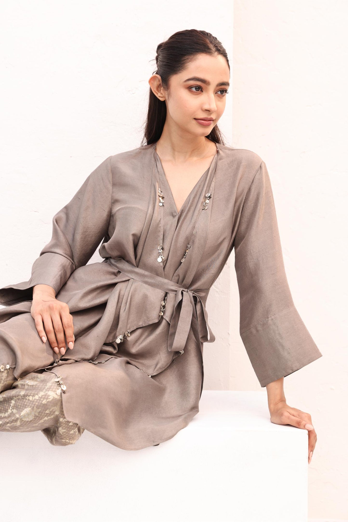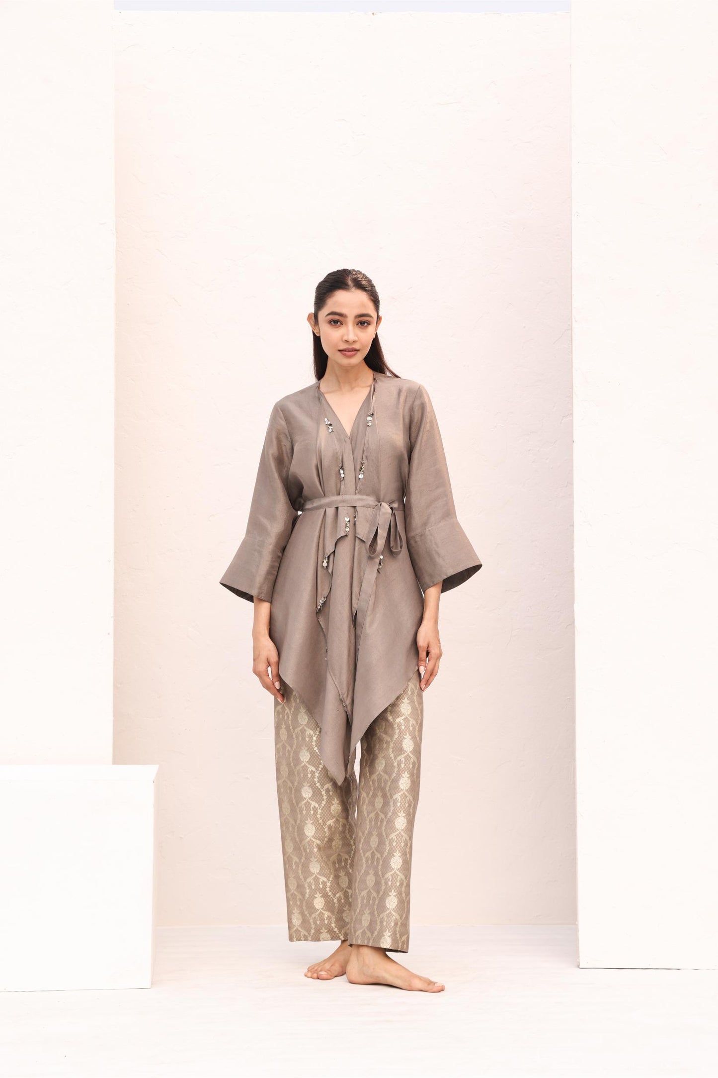 The Bella set merges softness and structure with effortless grace. A silk wrap-style top with a cascading front drape is finished with hand-done metallic detailing, while a coordinating belt defines the waist. Paired with one-of-a-kind brocade pants, tailored with the precision of a classic trouser, this ensemble embodies modern opulence.