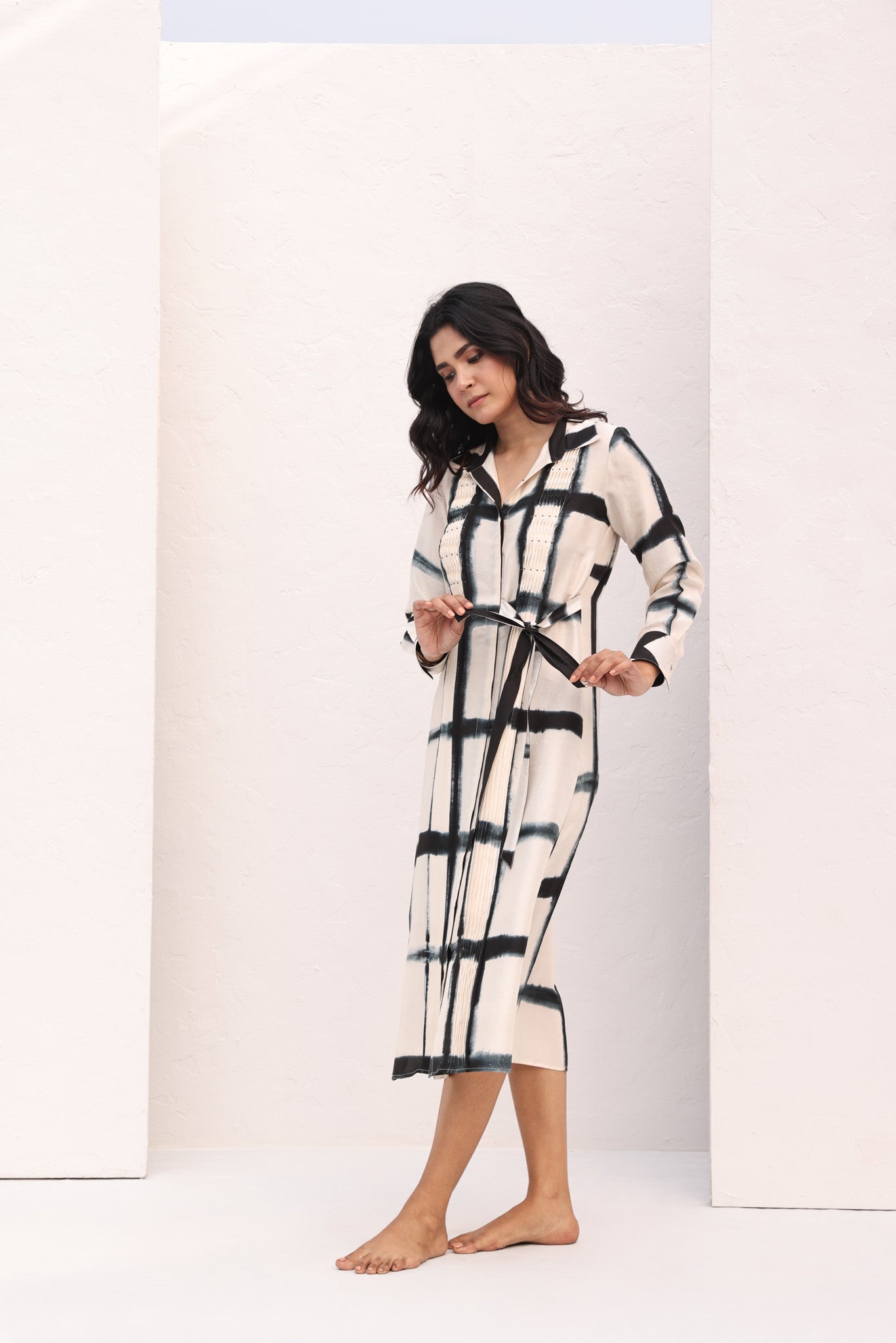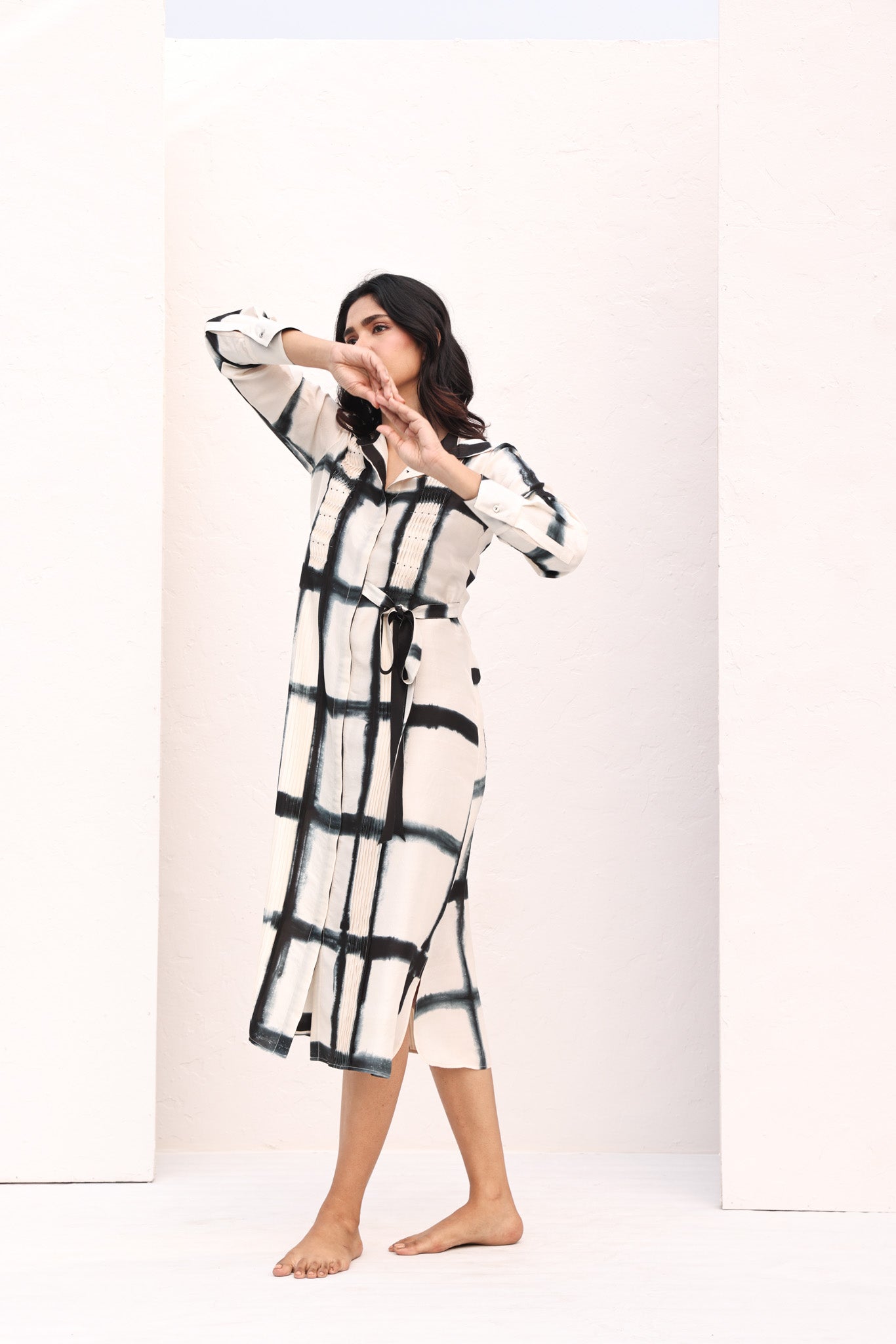 The Cora dress redefines timeless luxury in ivory silk. Hand tie-dyed in a subtle square motif, it features intricate pleating reminiscent of smocking, delicately highlighted with beads. The structured shirt collar and artistic sash belt create a modern silhouette, while the carefully tailored length makes it an elegant choice for any time of day.