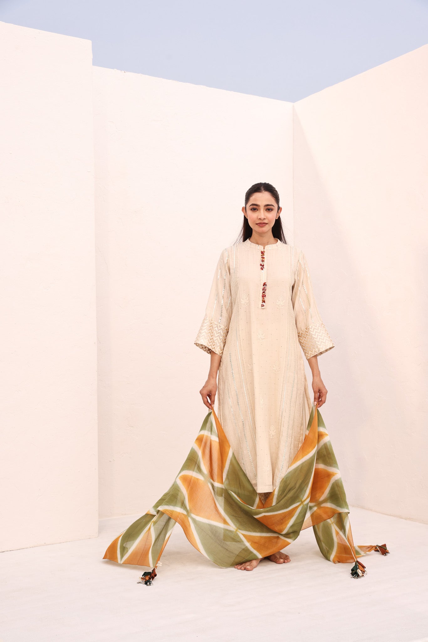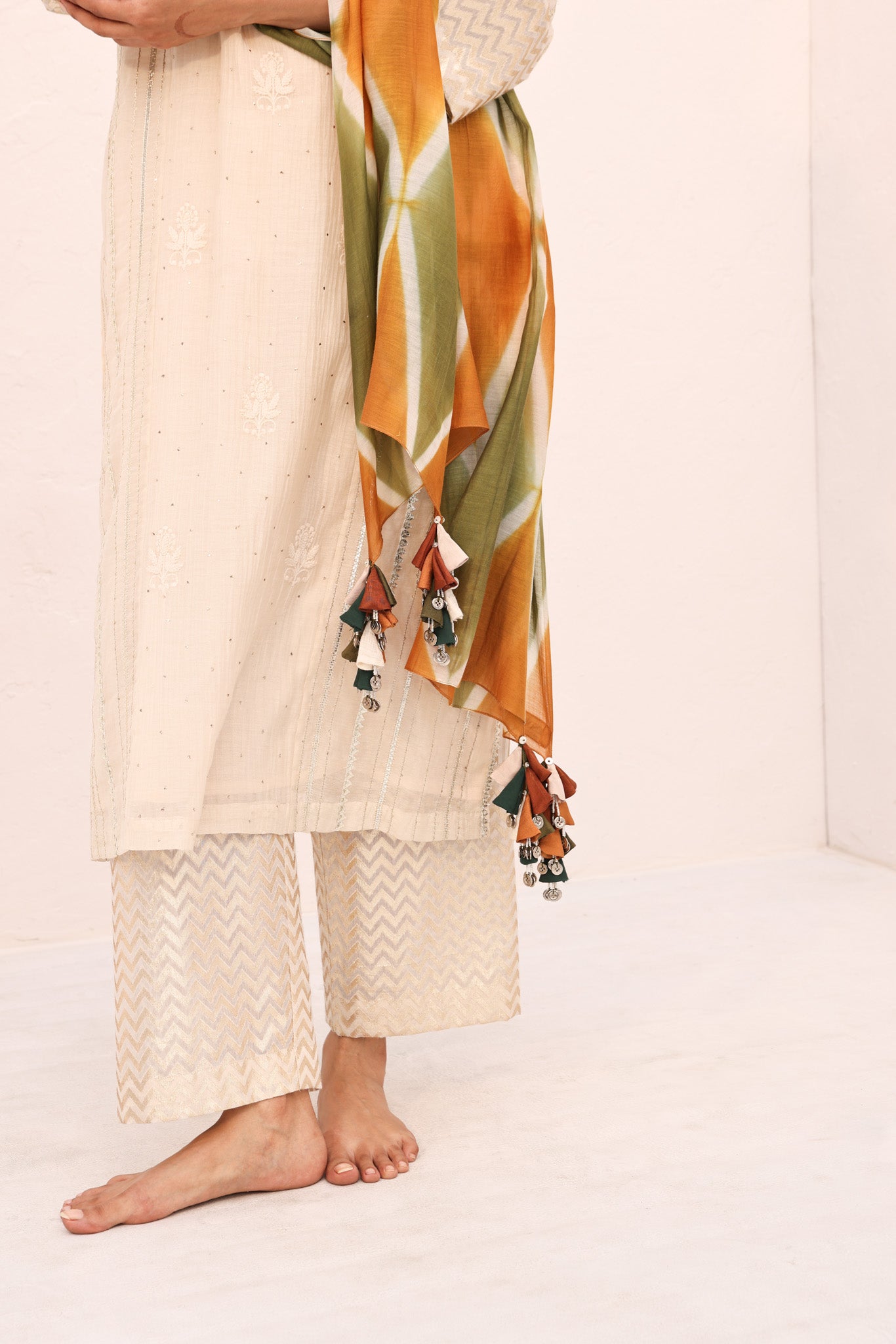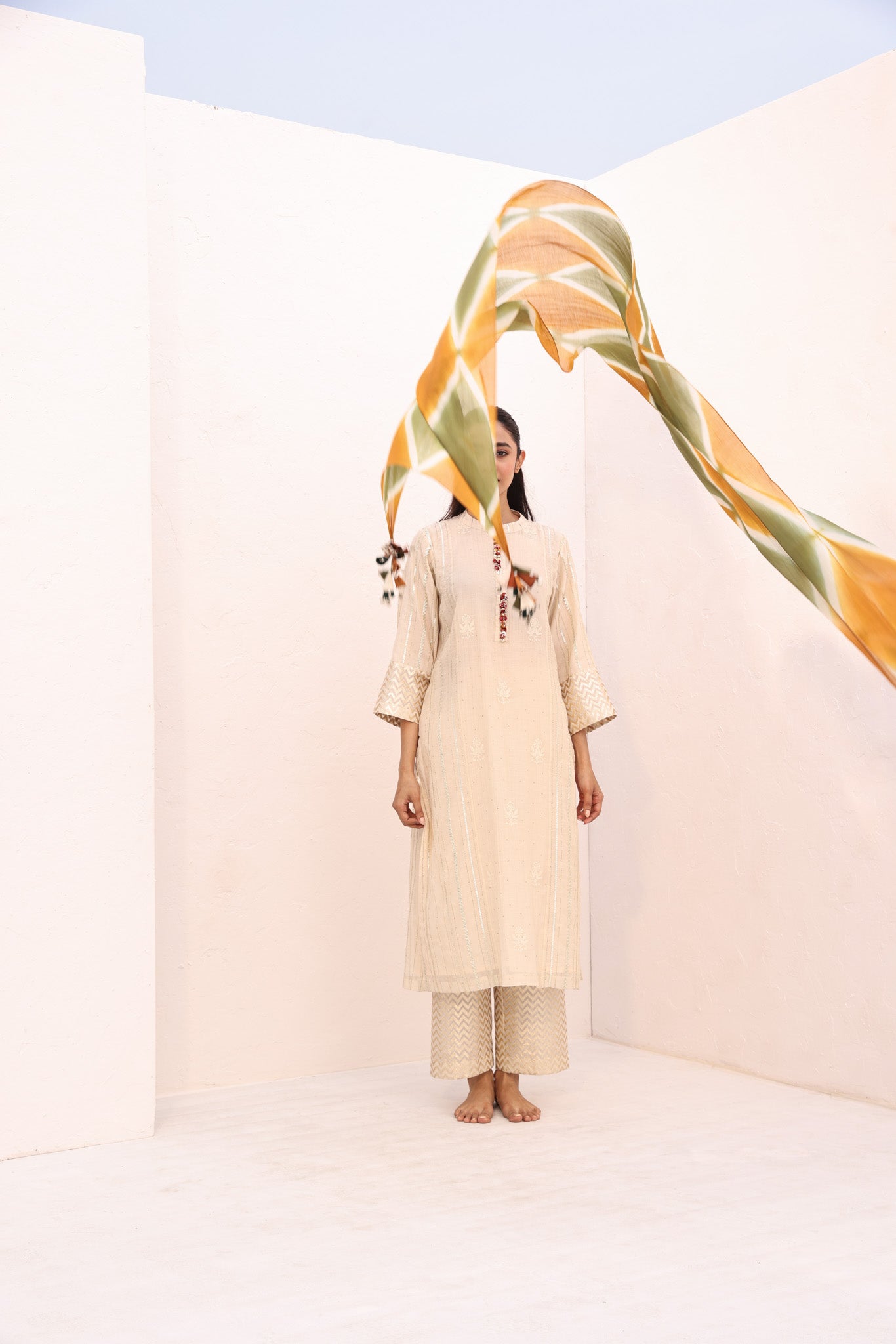 The Ivy kurta set marries understated sophistication with festive allure. An ivory straight-cut kurta, adorned with panels of gota, chikankari, and mukaish, is elevated with gundi and mixed-material accents along the front placket. Panelled tissue pants offer a subtle counterpoint, while the tie-dyed dupatta in complementary colours, hand-finished with latkans, adds a vibrant, celebratory focal point—crafted for those who appreciate refined, artisanal luxury.
