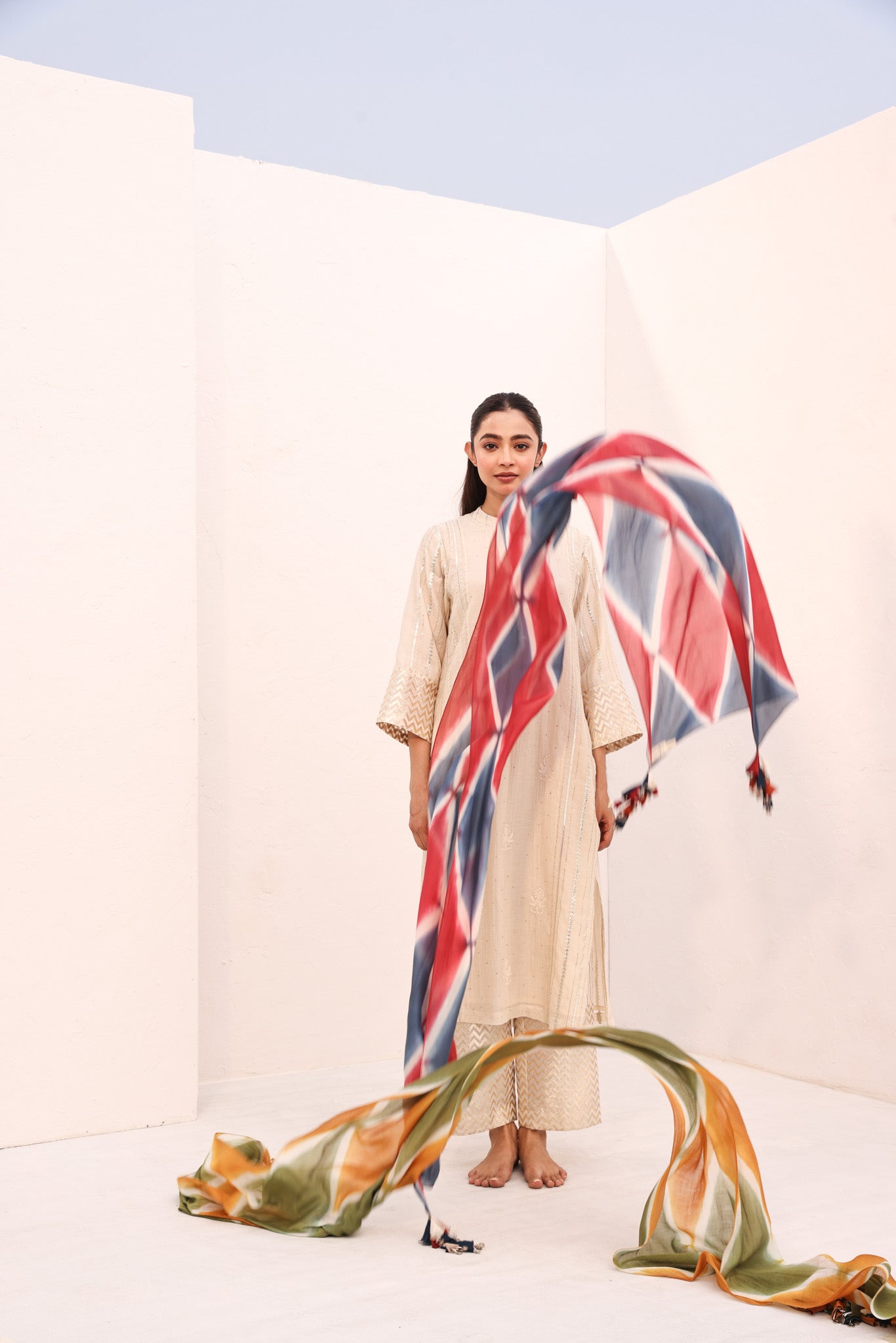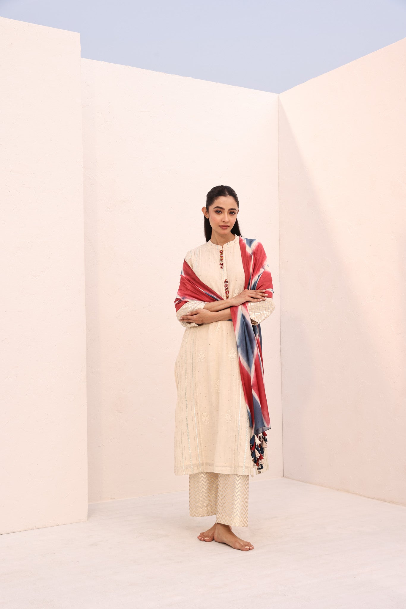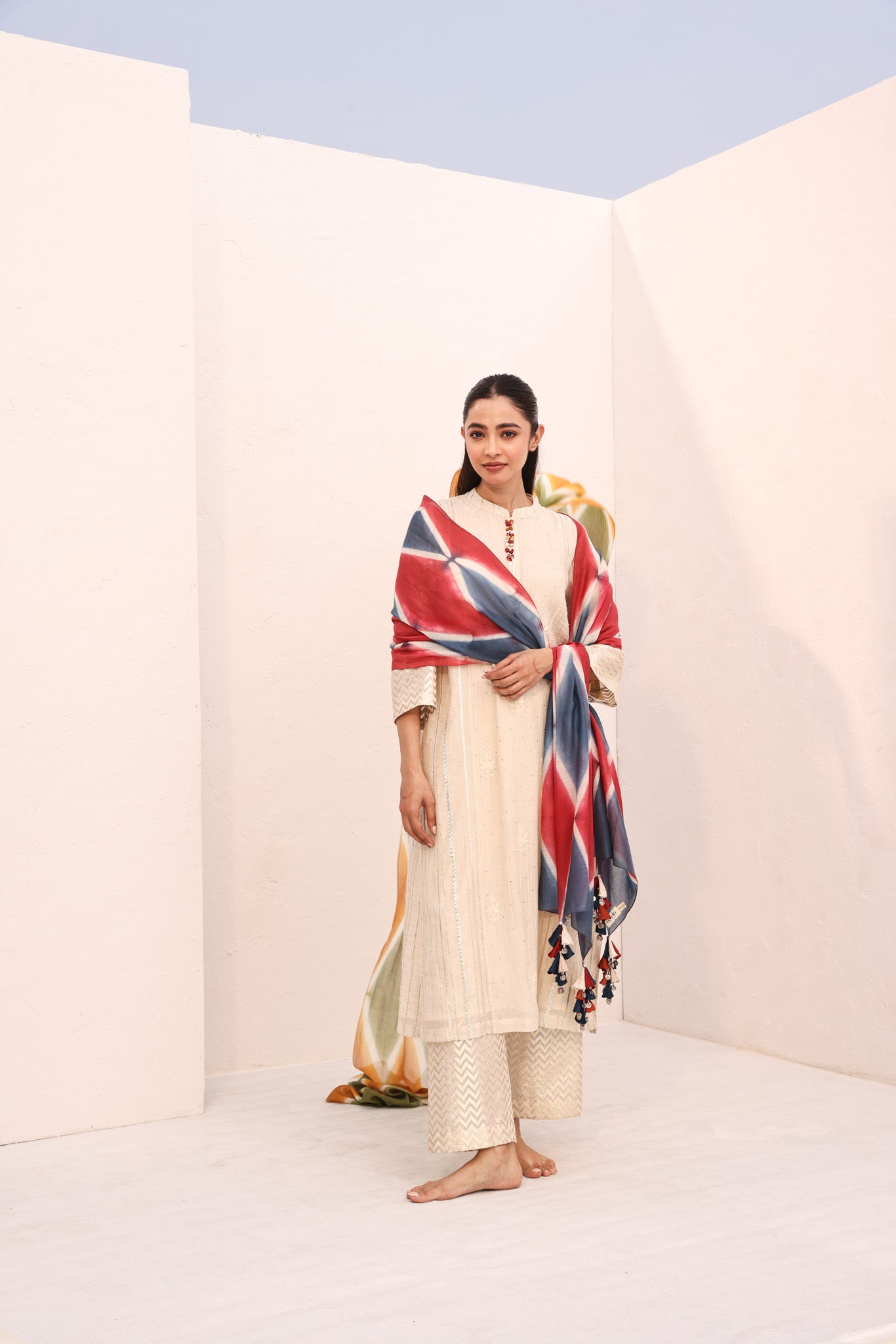The Ivy kurta set marries understated sophistication with festive allure. An ivory straight-cut kurta, adorned with panels of gota, chikankari, and mukaish, is elevated with gundi and mixed-material accents along the front placket. Panelled tissue pants offer a subtle counterpoint, while the tie-dyed dupatta in complementary colours, hand-finished with latkans, adds a vibrant, celebratory focal point—crafted for those who appreciate refined, artisanal luxury.