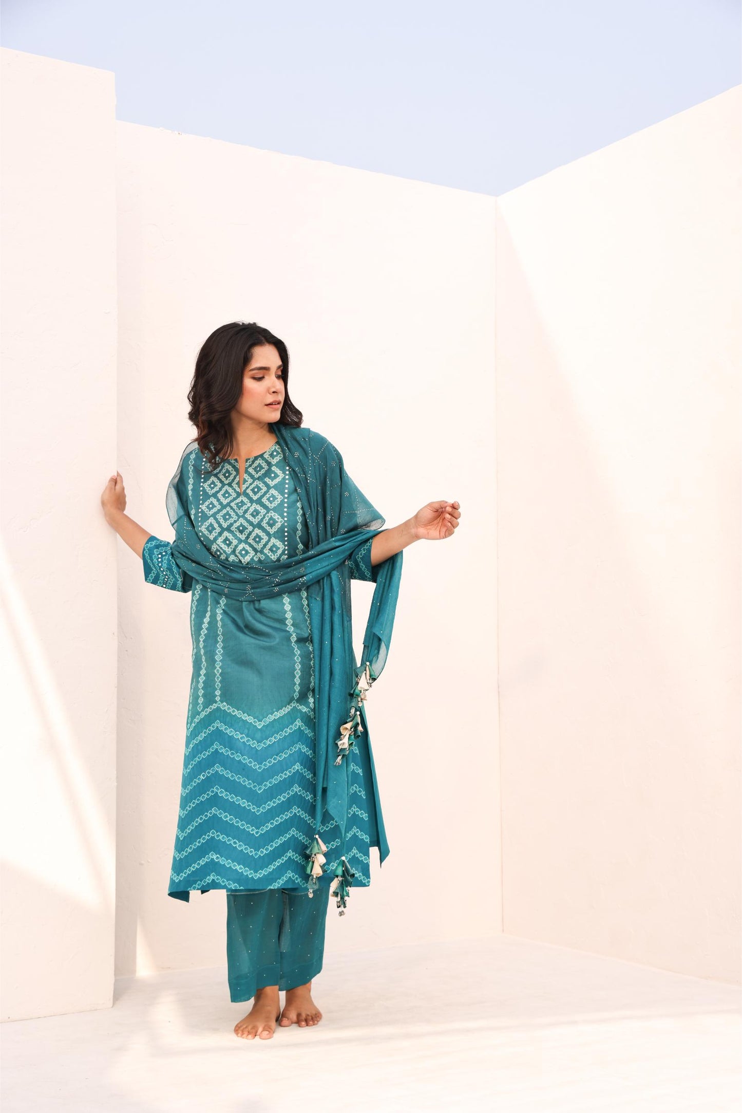 The Robyn kurta set in handwoven pure silk evokes a starry night sky with delicate mukaish embroidery on the front and sleeves. Featuring ravelling hand tie-dye and ombré effects, it’s paired with tailored pants with a subtle mukaish panel. The statement dupatta is divided into five embroidered mukaish panels, each accented with exquisite handmade latkans—an elegant fusion of artisanal heritage and modern sophistication.