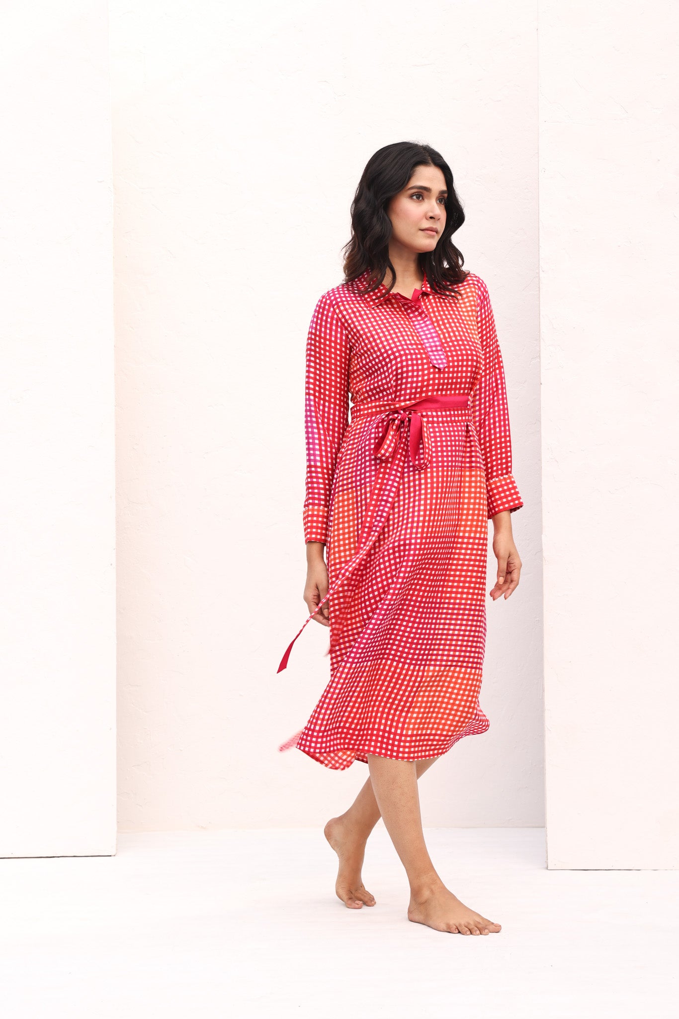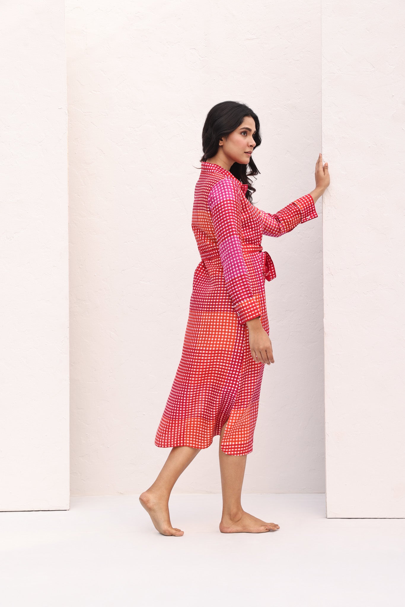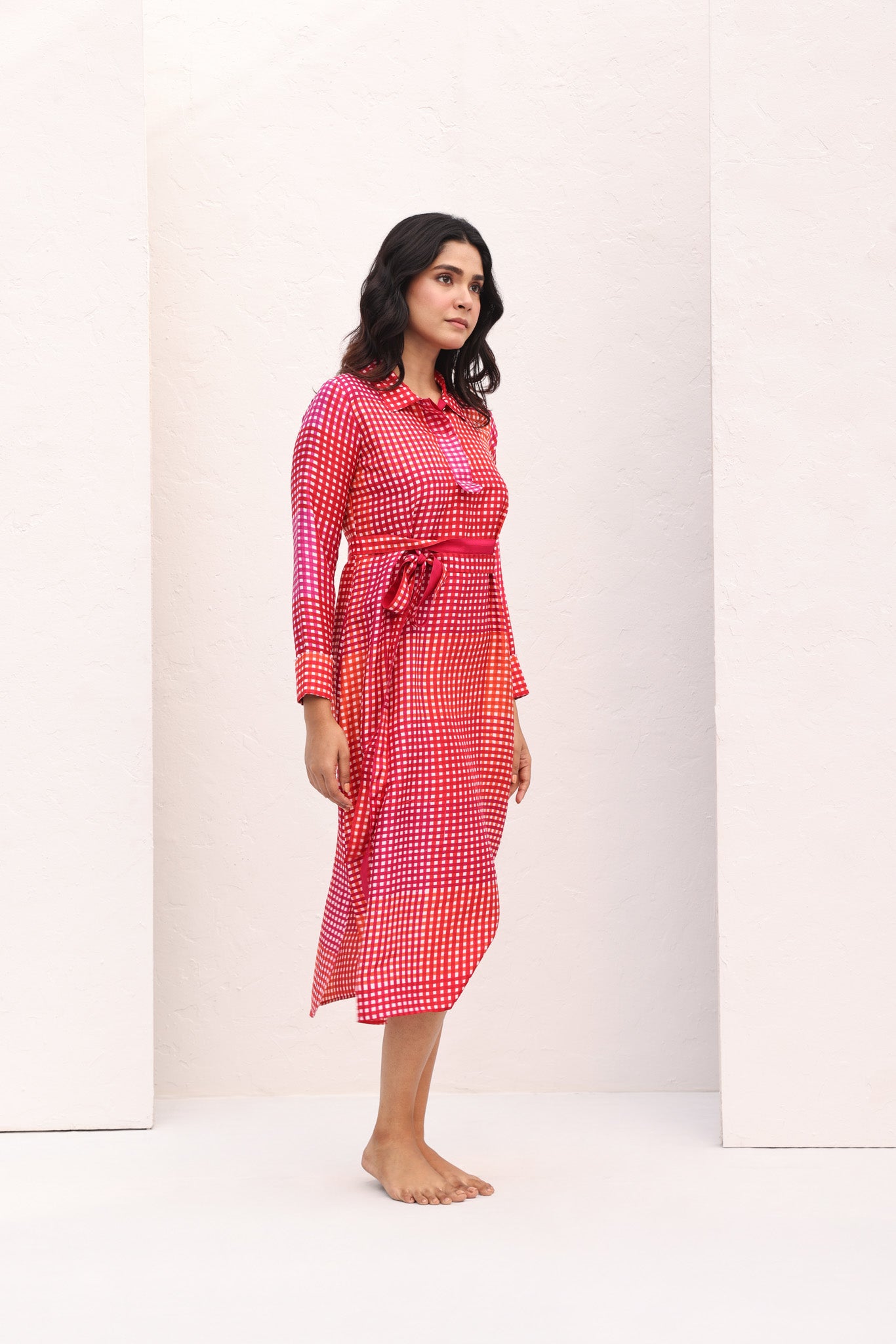 Crafted in silk with hand block printed checks, the Silk tie dress offers versatile styling with a belt that wraps elegantly around the waist to sculpt the silhouette. French-style cuffs adorned with delicate stone embellishments lend a refined finish. With its impeccable length and timeless design, this dress embodies modern luxury suited for every hour of the day.