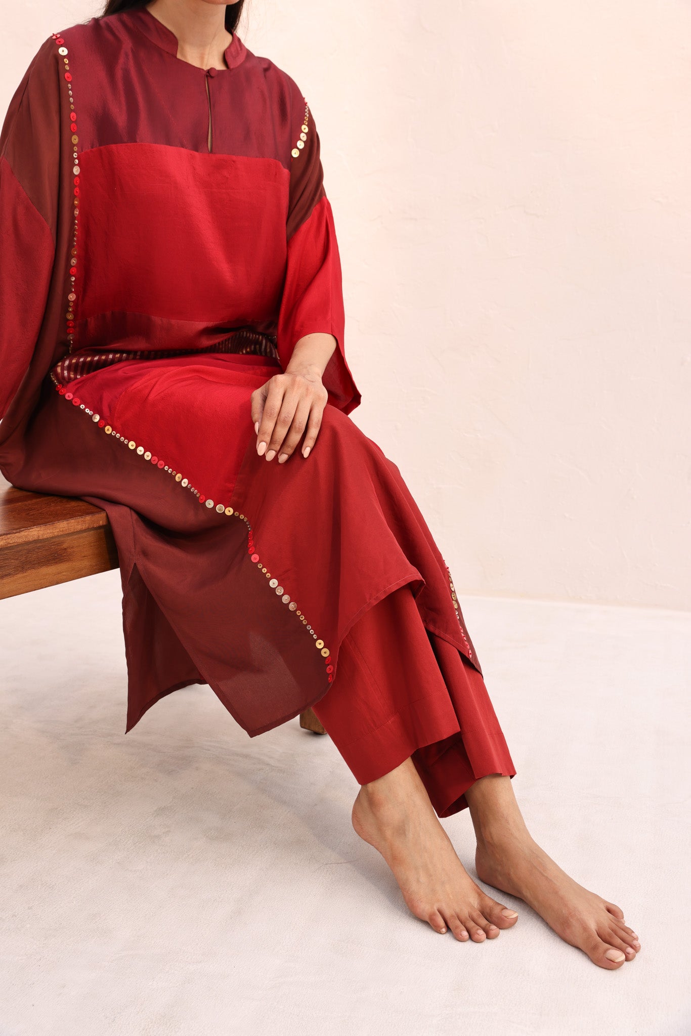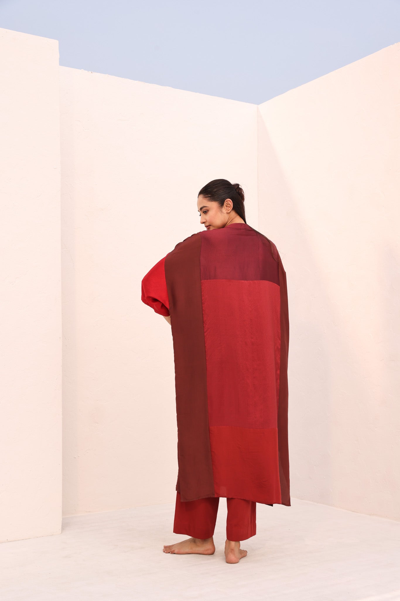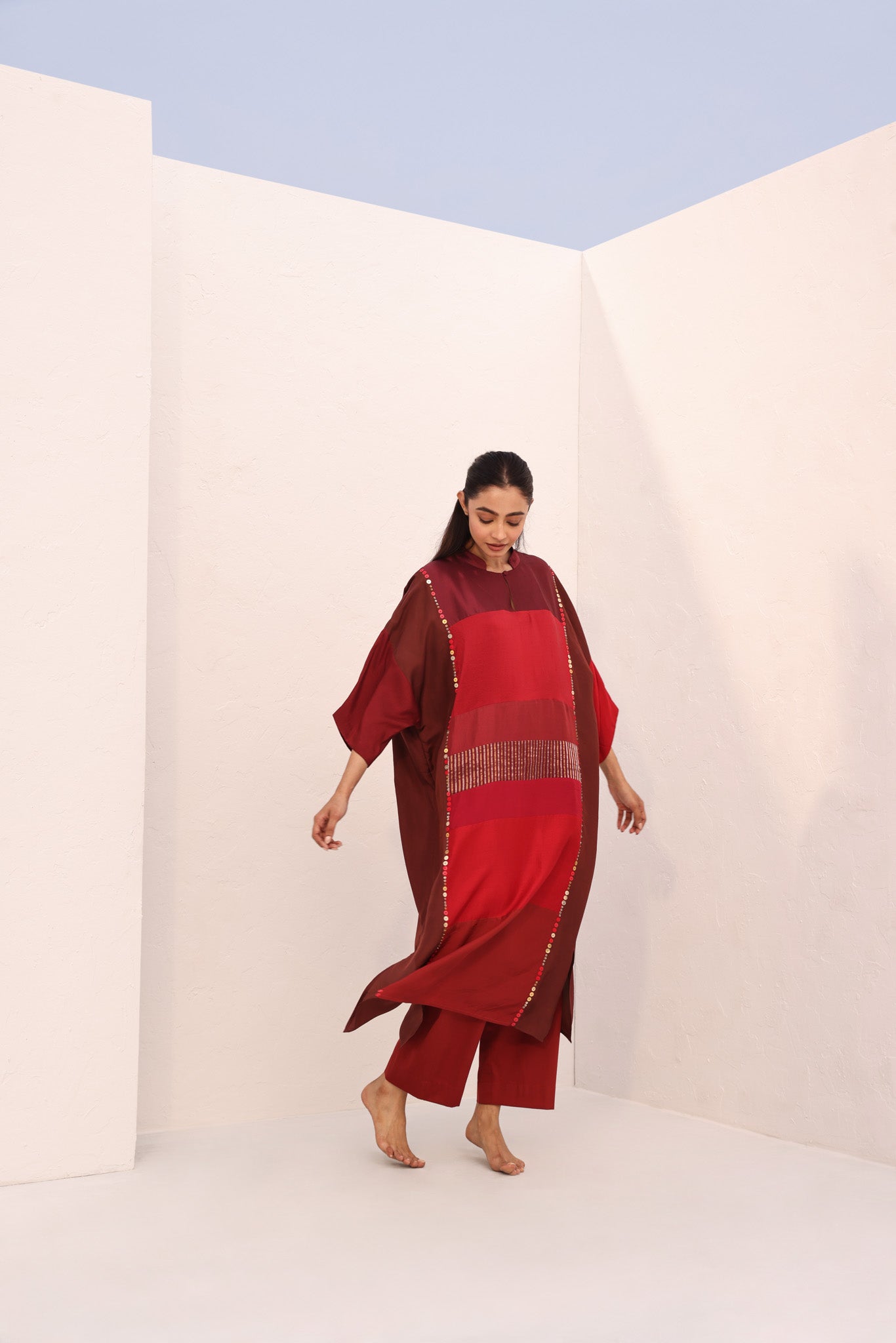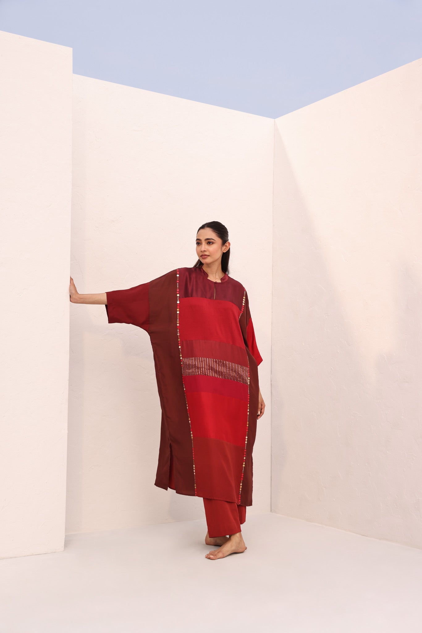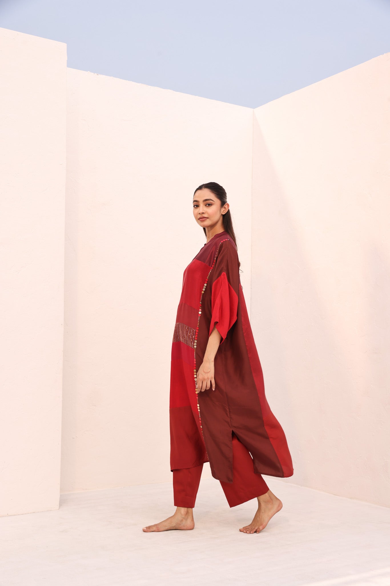 The Tia kurta set is crafted from thoughtfully upcycled textiles in harmonious, complementing tones, the kurta is panelled at the front and back to create depth and movement. Hand-finished vertical tikki detailing elongates the silhouette, while layered textures and prints come together in an oversized, kaftan-inspired form.