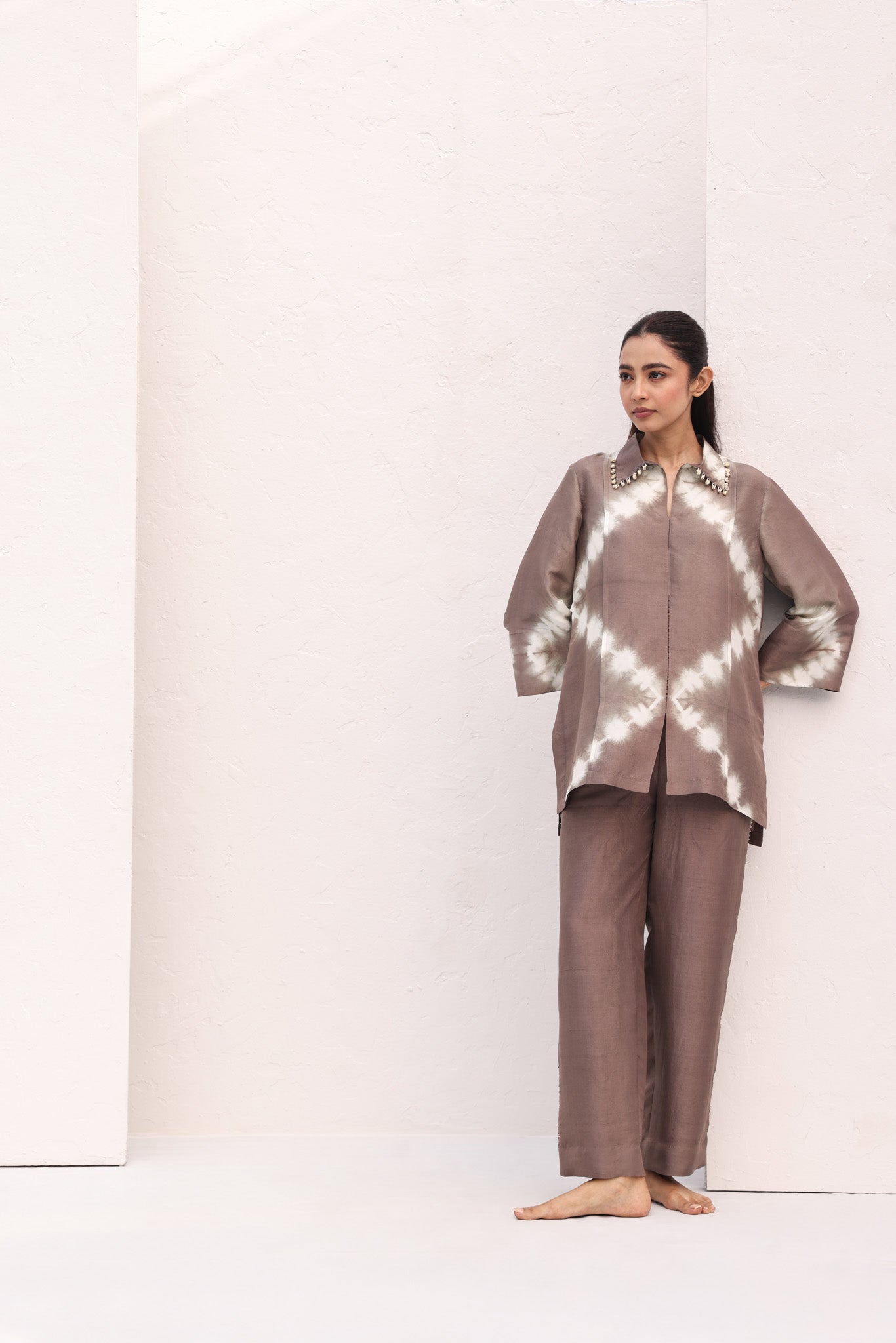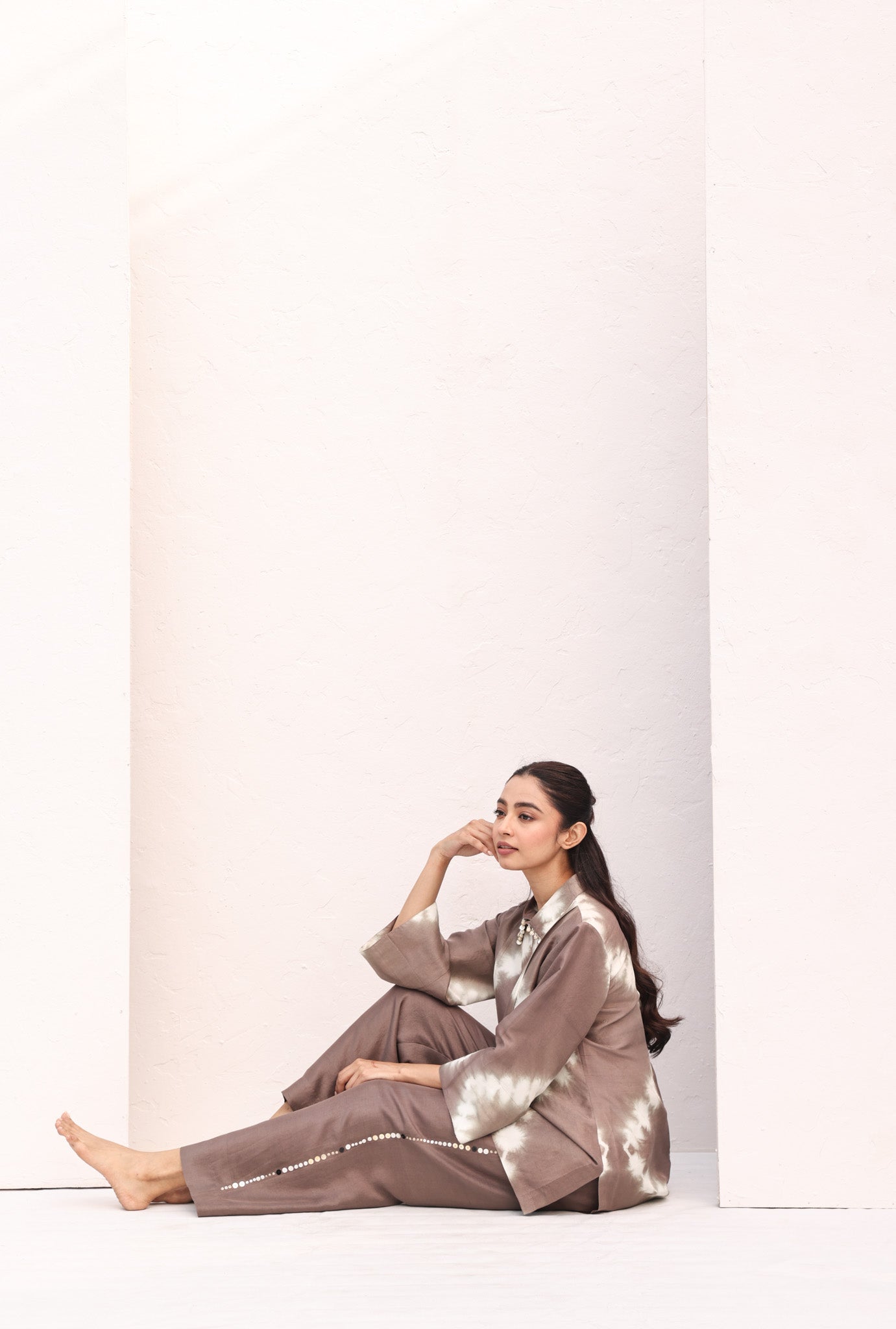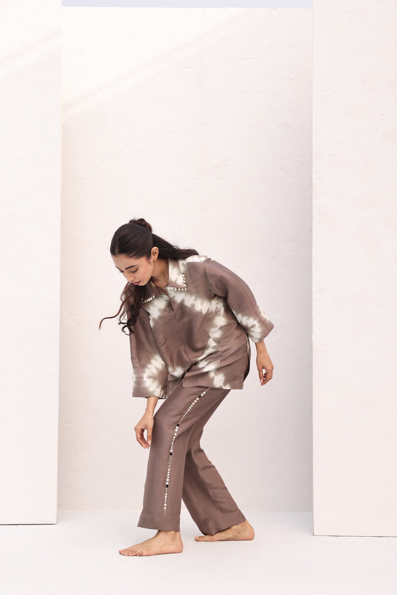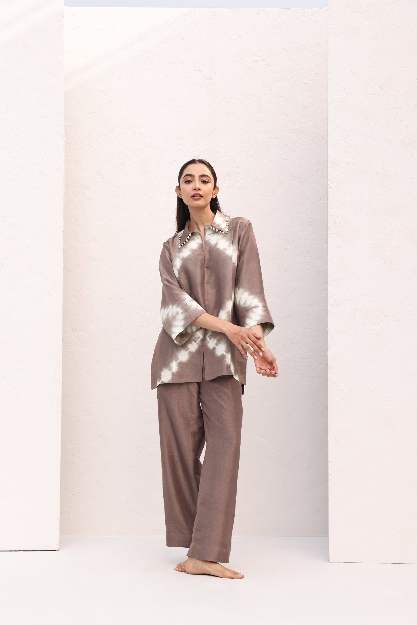 The Tilly set balances structure and fluidity through thoughtful craftsmanship. A silk shirt-style top rendered in soft tie-dye hues is adorned with hand-finished mother-of-pearl details at the collar. It is paired with straight-cut solid silk pants, subtly enhanced with tikki detailing at the sides—designed for elevated, modern dressing.