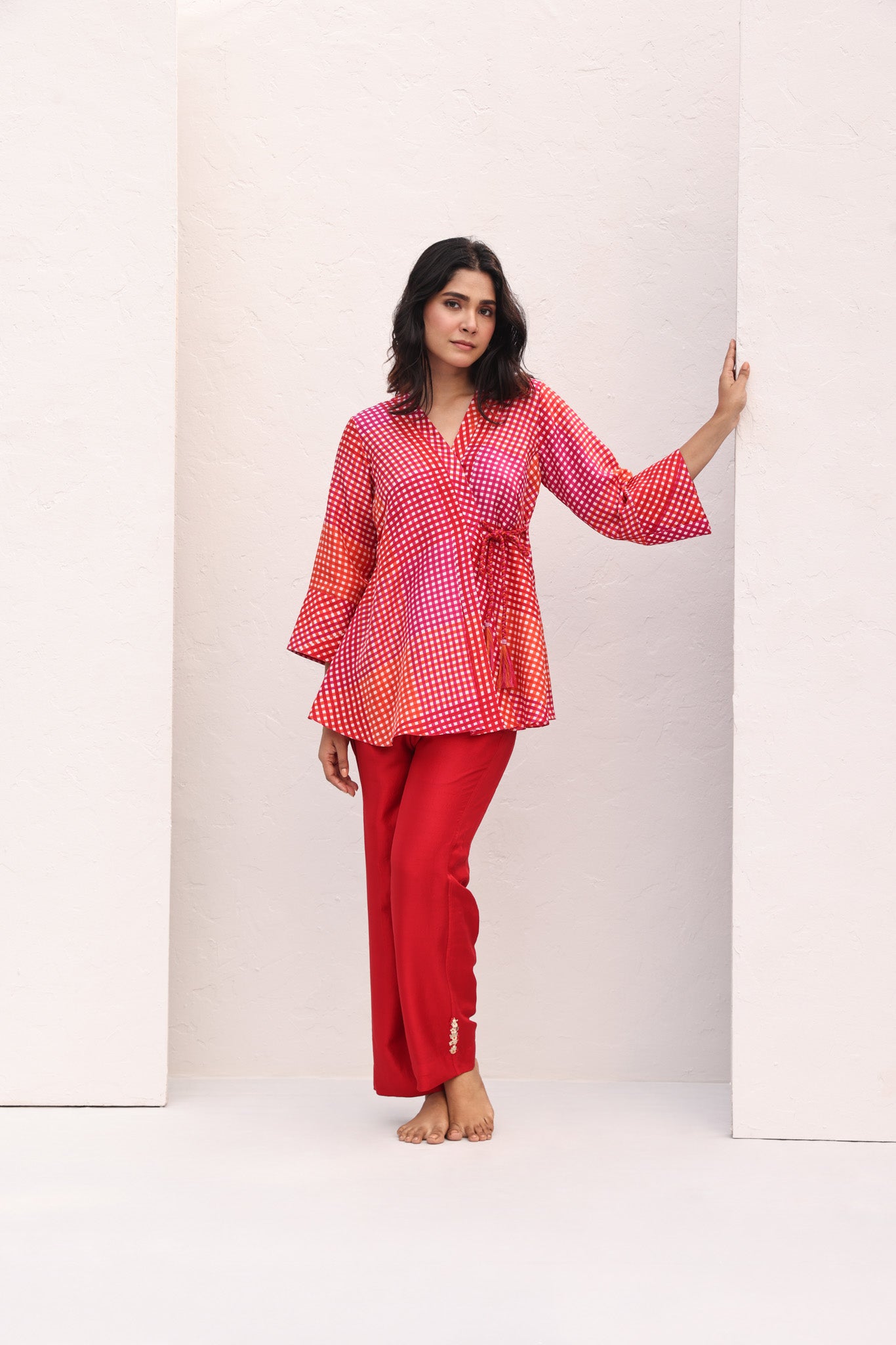 Bold hues meet heritage craft in the Willow Set. A wrap-style silk top in a vibrant hand block–printed check design - Striking, sophisticated, and effortlessly refined.